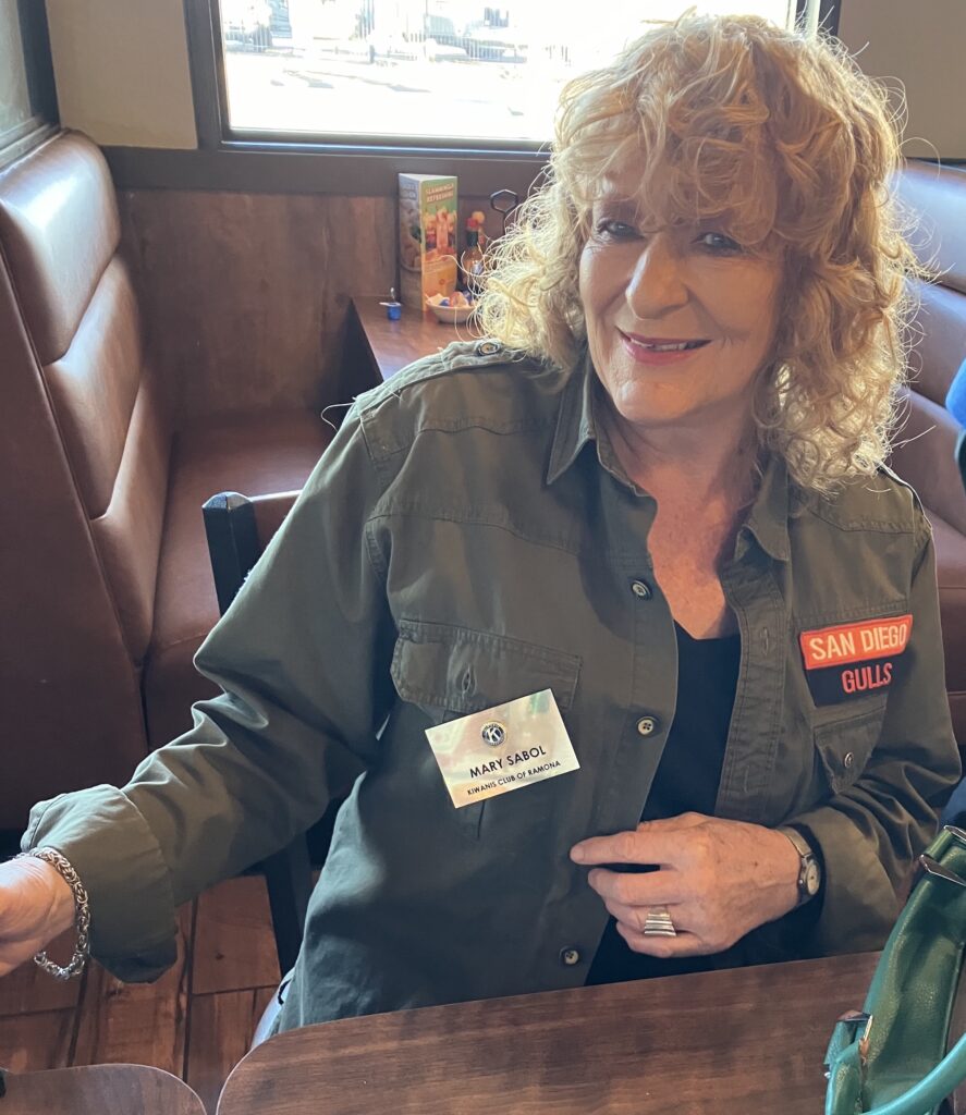 Mary Sabol wears the gold badge she received from Membership Chair Darryl Albertson during Kiwanis Club of Ramona’s breakfast meeting on Saturday, Sept. 20.