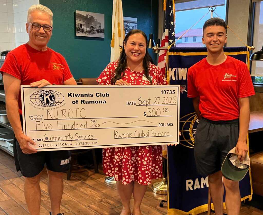 Kiwanis Club of Ramona President Tiffany Lynch presents a check for $500 to Ramona High School Navy Junior Reserve Officers Training Corps Cmdr. Rick Jordan, left, and Cadet Jason Salazar during Kiwanis’ breakfast meeting on Saturday, Sept. 27.