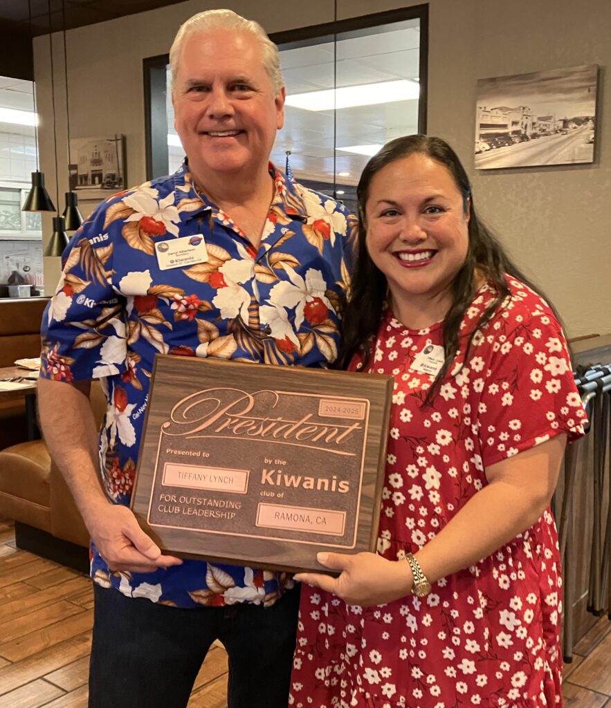 Immediate Past President Darryl Albertson presents Kiwanis Club of Ramona President Tiffany Lynch with her president’s plaque “For Outstanding Club Leadership.”