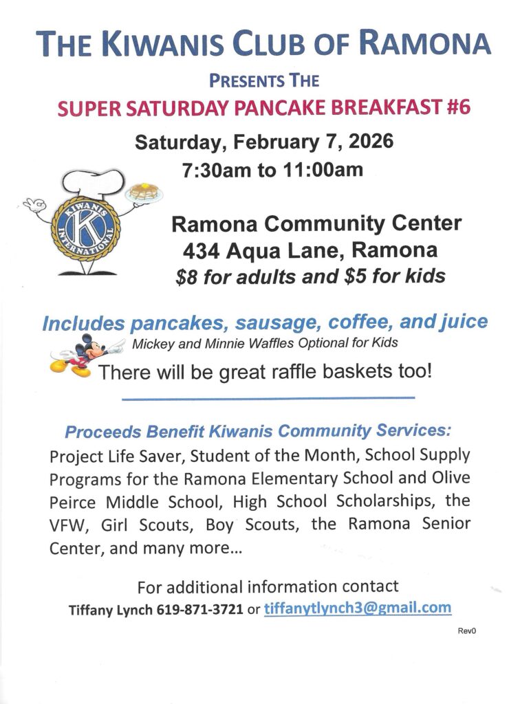 It is “Super” because it is always the Saturday before Super Bowl Sunday, and the food is always SUPER! Includes pancakes, sausage, coffee, and juice and great raffle baskets too! It is held at the Ramona Community Center, 434 Aqua Lane. 7:30 AM – 11:00 AM